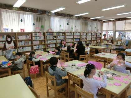 今日のテーマは、ミニお話会と簡単な工作「さくらのモビールをつくろう!」でした。本校の子どもたちと一緒に、来年度入学するお子さんと保護者の方々が参加して、楽しいひとときを過ごしました。