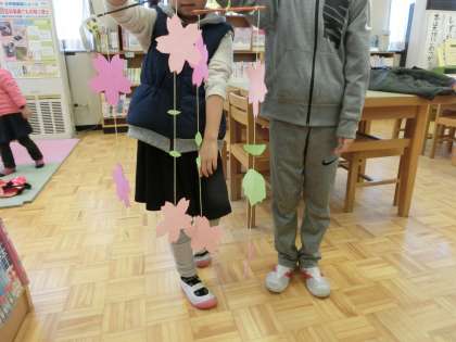 後半の簡単な工作では、さくらの花びらを切り抜き、糸でつなげて、素敵なモビールを完成させていました。