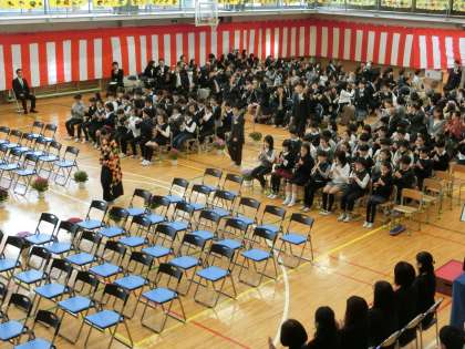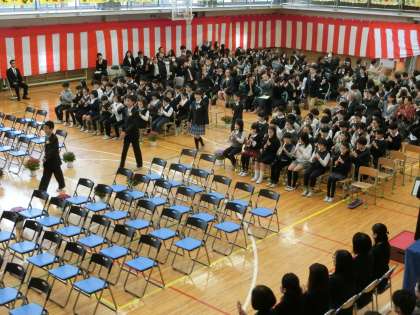 5年生のリコーダー演奏と大きな拍手の中、卒業生が入場しました。たくさんのご来賓・保護者の皆様のご臨席をいただき、今年度の教育活動を締めくくる行事となりました。