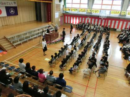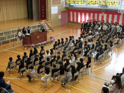 校長の話、お祝いの言葉、担任や教職員の紹介、そして在校生代表の歓迎の言葉と続きましたが、1年生は姿勢よく座り、話を聞いたりあいさつをしたり、立派な姿勢で臨む姿が印象的でした。緊張感もあった中ですが、笹原小学校の仲間入りをした子どもたちです。