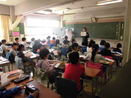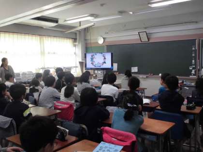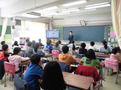 5・6年生は、担任がICTを活用したプログラムで15分間の授業を進めていきます。世田谷区立小学校で共通のプログラムで、年間105回35時間分の学習活動を進め、このほかに週1時間(1コマ)英語活動支援員の先生入っていただき、担任とのT・Tによる学習活動を行っていきます。
