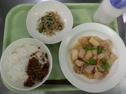 昨日は春キャベツが給食に出ましたが、今日の給食の肉じゃがうま煮には新じゃがいもと新たまねぎを使用しています。これらの野菜も、普通のものに比べて皮が薄くみずみずしいのが特徴です。新学期が始まって初々しい気持ちの春にぴったりですね。今日のごはんにはかつおでんぶもついていて食べやすいと思いますので、残さずたくさん食べてください。