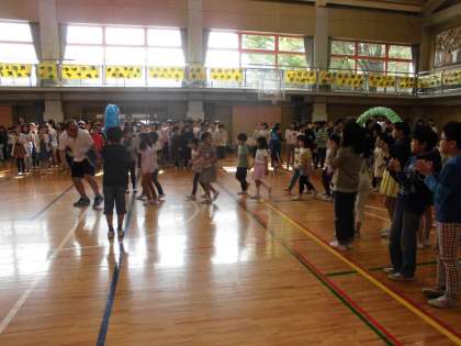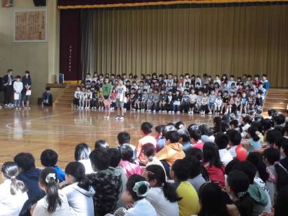 今日の1時間目は、1年生を迎える会でした。2年生から6年生までの子どもたちが待っている体育館へ1年生が入場すると大きな拍手が起きました。