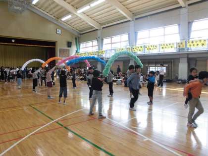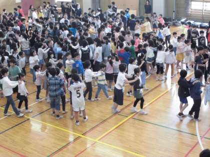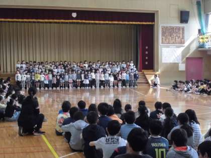 続いて、全校の子どもたちによるゲーム「じゃんけん列車」を行さったあと、1年生に早く覚えてもらえるよう、校歌を歌いました。