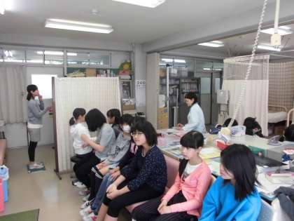 今日の健康診断は、視力検査です。保健室に順番に並び、手順を聞いた後、一人ずつ測定します。眼鏡を使用している子どもは、裸眼視力・矯正視力の両方を測ります。