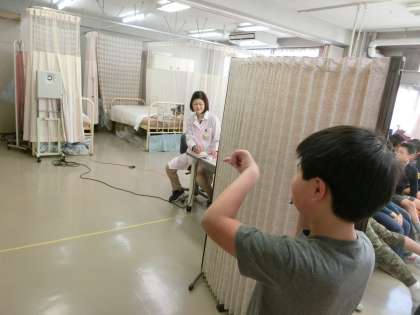 保健室で検査を行いました。養護教諭から検査の仕方についての説明を受け、順番に検査を受けていました。