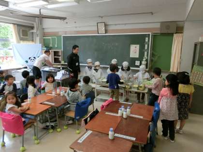 給食の準備の仕方について担任の先生が丁寧に説明し、みんなで手をきれいに洗い、配膳の当番になった子どもたちは、給食用の白衣に着替え、給食の調理員さんが運搬してきてくれた給食用ワゴンを教室に入れて準備は完了です。