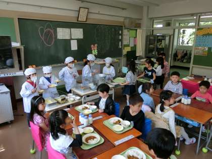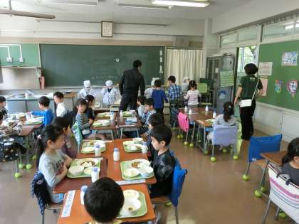 当番の子どもたちは、上手に盛り付けをし、順番に給食を受け取り、自分の席に運んでいました。担任と応援に来た教職員が見守る中、子どもたちで力を合わせて配膳していました。