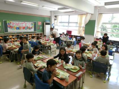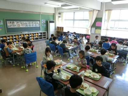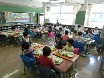 今日の献立は、「カレーライス・シャキシャキサラダ・くだもの(りんご)・牛乳」です。初めての給食となる1年生が準備しやすく食べやすく考えた献立ですが、人気の献立だけあって、「おいしいよ!」と笑顔いっぱいの1年生でした。