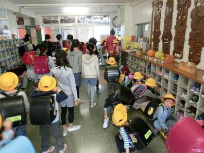また、昇降口の靴箱では、6年生のお兄さんやお姉さんのアドバイスをしっかりと受け止め、きれいに靴を入れている姿が印象的です。立派ですね。