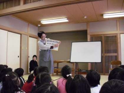 まず、すばなし「3枚のおふだ」を聞いて、2年生は、すっかりお話の世界に入り込み、楽しんでいました。パネルシアター「ぶす」は、見て、聞いて、大喜びでした。ブックトークは「くいしんぼう」がテーマでした。いろいろな本の紹介をしていただきました。