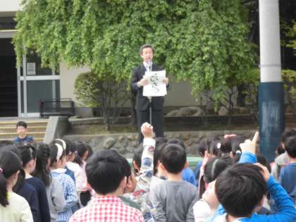 今日の校長先生のお話のキーワードは「あいさつ」でした。今週はあいさつ週間です。また、今月の人格の完成をめざしてのテーマもあいさつです。正門では、朝、あいさつキッズ(子どもたちの有志ボランティア)によるあいさつが元気に響きました。