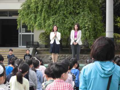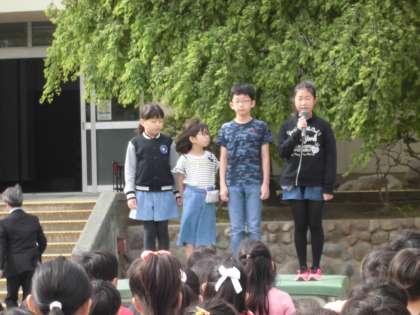 朝会でも、図書館司書のお二人の自己紹介の後、3年生と6年生の代表によるあいさつ標語の発表がありました。