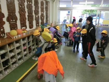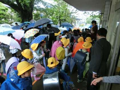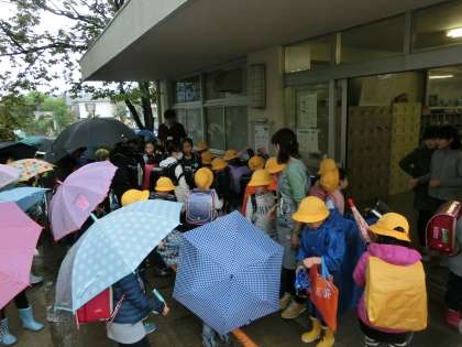 1年生にとっても、傘をさしての登校は初めてです。お世話役の6年生もそろったので、他の学年よりも少し早く、傘を傘立てに入れ、昇降口に誘導しました。手の空いている教職員も手伝いをしながら、「おはようございます!」と元気に登校しています。