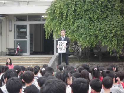 今日の校長先生のお話のキーワードは「穀雨」でした。二十四節気の1つで、穀物を潤す雨の多い頃ということです。先週のあいさつ週間についてと、今日から始まる笹の子スピーチの紹介とともにお話しいただきました。
