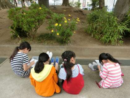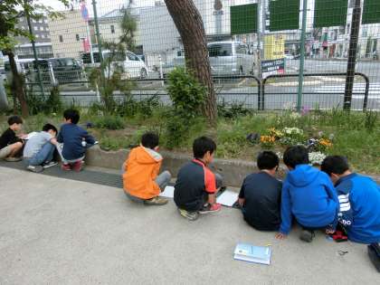 ノートに植物の様子をスケッチしたり、虫めがねで詳しく観察したりしながら、校庭の植物を観察していました。細かいところにも発見があり、ノートに記録する姿が印象的でした。
