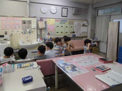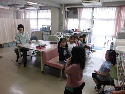 今日は1年生の視力検査がありました。検査時に目を隠すための器具に興味津々な子どもたち。でもしっかり養護の先生のお話を聞き、きちんと器具を扱って検査をしていました。