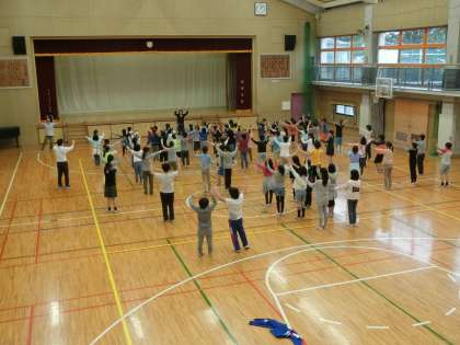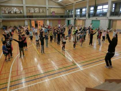 今日の元気タイムで、5年生は体育館で、川場移動教室のキャンプファイヤーでみんなで楽しむ踊りを元気いっぱい練習していました。
