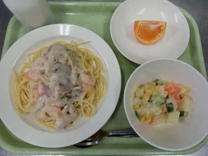 マセドアンとは、フランス語で「さいの目切り」という意味で、さいの目切りとは1cmくらいのサイコロ形に切ることです。マセドアンサラダはさいの目切りにした野菜をマヨネーズやドレッシングで和えたサラダのことを言います。様々な野菜をさいの目に切って使うことで、食感が楽しく彩りもきれいです。今日のサラダには、じゃがいも、にんじん、きゅうり、コーンが入っています。