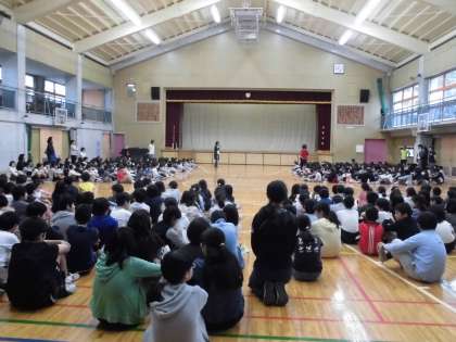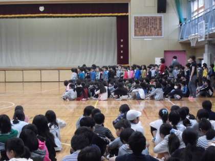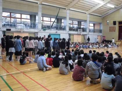今日の音楽朝会は、校歌を歌いました。歌う前に校歌クイズがありました。校歌の中に使われている言葉に続けて、正しい言葉を言うクイズです。学年毎の質問に上手に答える子どもたち。新しくいらした先生にも問題が出されましたが、皆さん正解でした。その後、1年生に聞かせるために、学年ごとに校歌を歌います。最後は1年生。しっかり覚えて元気な歌声を聞かせてくれました。