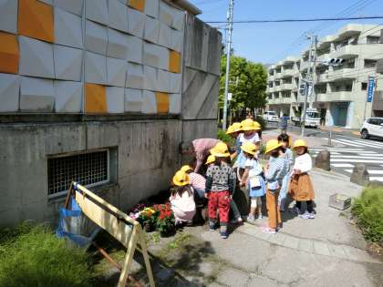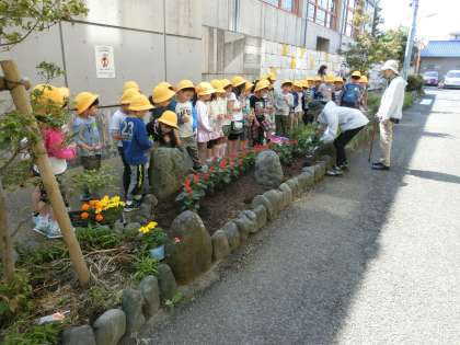 1年生は今日の1校時、地域ボランティアグループ「ぐるうぷ街」の方々の指導を受けながら、学校東側の歩道にある花壇で、花を植えました。一昨日予定していた活動ですが雨のため延期とない、今日は晴天の中、美しい花をみんなで分担して植えました。