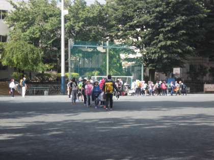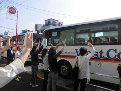お見送りの保護者の皆様、教職員に見送られ、いよいよ出発です。天気も良く、3日間楽しく充実した日となることを願っています。早朝より、お見送りに来校いただいた皆様、ありがとうございました。