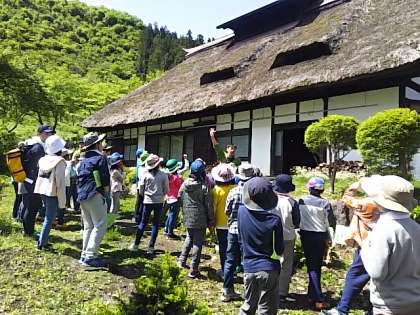 宿舎周辺を散策しながら、里山の仕組みや成り立ち、植物や動物、そして古民家などについて学習しました。