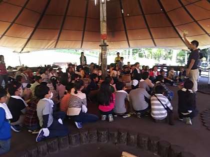 飯ごう炊さん場に集合し、補助員さんから、カレーライスづくりや注意することなどについて説明を受けています。