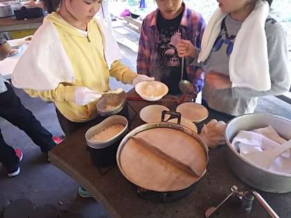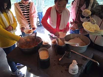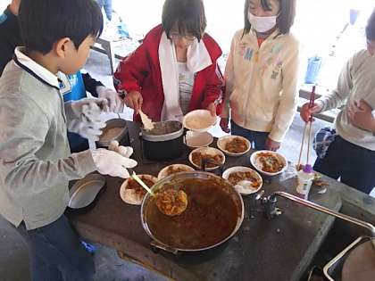 カレーライスができ上がり、盛り付けが始まりました。おいしそうな香りが、あちらこちらから漂って来ています。