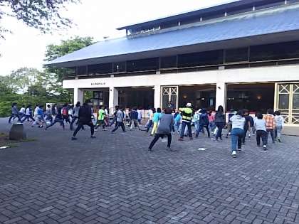 6時に起床し健康観察。朝の支度をして、お祭り広場で朝の集いを行いました。少しひんやりした空気を感じますが、とてもよい天気です。