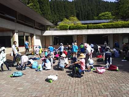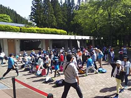 21世紀の森ハイキングに出かけるため、お祭り広場に集合して、準備運動を行い、ヒル対策を確認中です。気温も上がってきました。絶好のハイキング日和です。