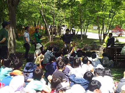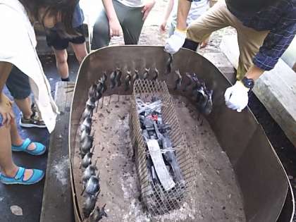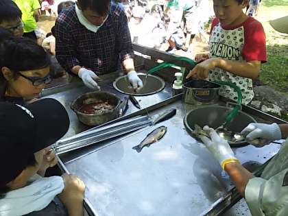 ふじやまビレジのスタッフの方々が、つかんだマスを串焼きにするための処理をする様子や、炭火焼きにする様子を見せていただきました。とても勉強になる体験になっています。