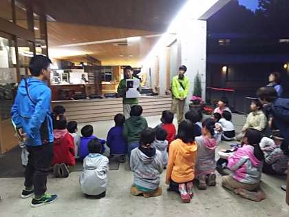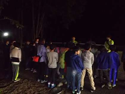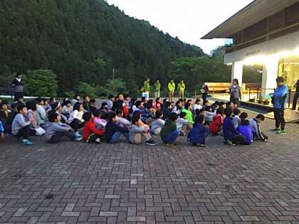 宿舎の方々の案内で、宿舎周辺を散策しながら、夜の川場体験をしました。ややひんやりとした空気の中、学級ごと3コースで、川場の生き物の生態や、五感を使って様々な情報を得て自然界を生き抜く方法などを学びました。