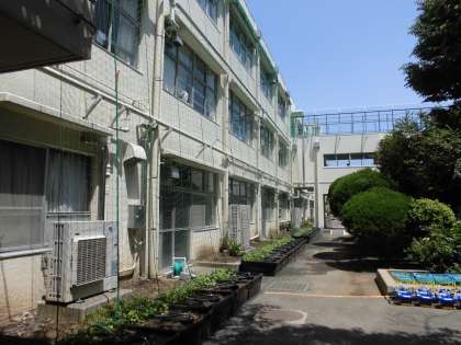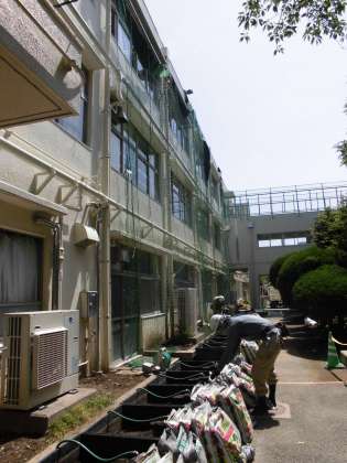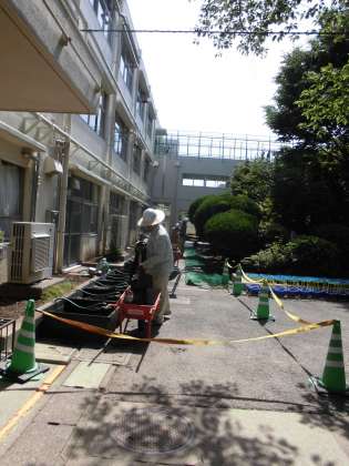 例年、北校舎中庭側で実施している「みどりのカーテン」ですが、今年は本日より開始です。造園業者さんの手により、土が入れ替えられ、ネットが張られ、へちまときゅうりとゴーヤの苗が植えられました。まだ小さい苗ですが、暑さの中、どんどん大きくなって葉を茂らせ、緑陰を作ってくれることでしょう。