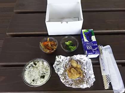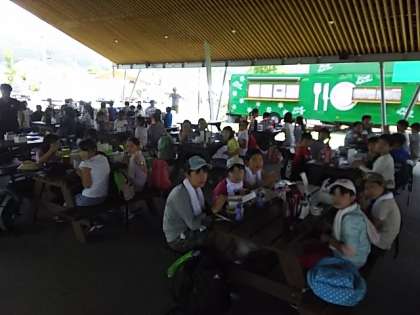 プラザ内の川場ルーフで、昼食の時間です。お弁当を食べながら、楽しく会話が弾んでいます。