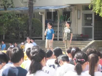 代表委員会からは、運動会のスローガン発表がありました。今年のスローガンは、「熱くなれ!協力だ!最後はみんなで笑い合おう!」です。最後まで全力で協力して取り組み、勝っても負けても最後はみんなで笑い合える運動会にしたいという願いがこめられているそうです。このスローガンのもと全校で取り組んでいきます。