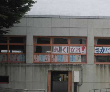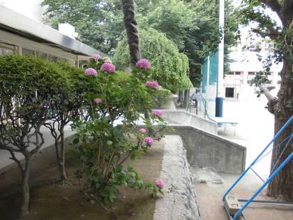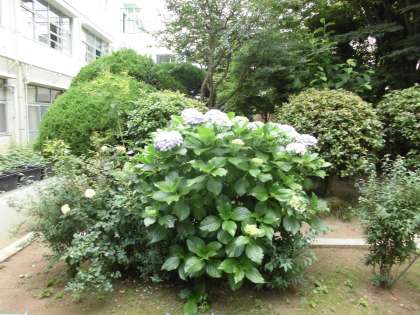 校内の様々な場所で紫陽花が咲いています。場所によって本当に色が違います。校庭の紫陽花から見える体育館には、スローガンの下に大プログラムが掲示されました。運動会の準備も着々と進んでいます。