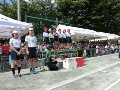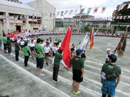 校旗・応援団を先頭に、全校の子どもたちが学年順に入場行進をしました。