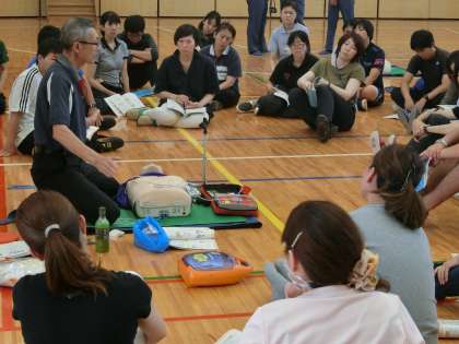 救命処置としての「心肺蘇生」と「AEDによる除細動」を実技を繰り返しながら研修しました。また、その他の応急手当や救急車の利用方法などについても、テキストや解説を通して研修しました。