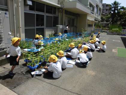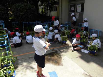 ずいぶんとつるが伸びてきています。自分の朝顔のつるを、支柱に丁寧にまきつけている子どももいました。これから夏に向けてぐんぐん伸びていきます。楽しみですね。
