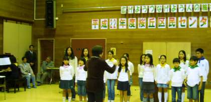 閉会式のとき、小さな親切運動の表彰式が行われました。本校、桜丘小学校、桜丘中学校の子どもたちのグループ「キッズコーラスSACOMI」が地域の指導者とともに表彰を受けました。キッズコーラスは、地域の施設等で歌い、社会にあたたかな心の輪を広げています。表彰を受けた後、3曲披露しました。キッズコーラスは、土曜日の午前中、地域の方々から指導を受け、本校音楽室で練習しています。