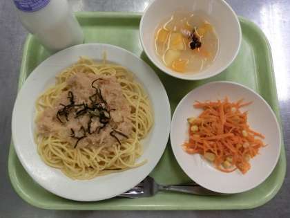 今日のにんじんサラダは、笹原小学校全体で18kgものにんじんを使っています。本数にすると60本以上です。このにんじんを、調理員さんが1本1本せん切りにしてくれました。機械を使って切るより、人間の手で切った方が細く切れておいしいからです。スパゲッティの大根おろしは、35本の大根を使っています。それだけ苦労して作ってくれた給食を、ぜひ味わって食べてください。