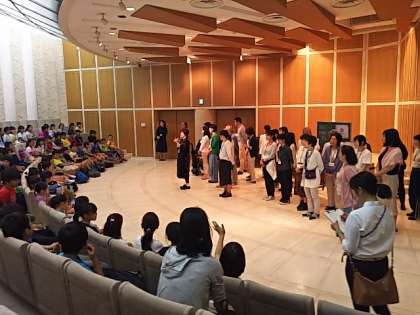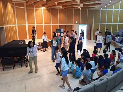 美術館の講堂で、学芸員の方から鑑賞の仕方やスケジュールなどの説明を受け、鑑賞ボランティアの方々と3人程度のグループで鑑賞活動を進めています。屋外の展示やライブラリーなどにも立ち寄って、世田谷美術館全体についても学んでいます