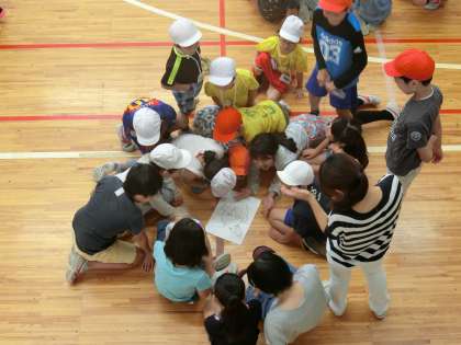 体育館では赤グループと青グループの笹の子班で集合し、福笑いの進め方について説明があり、それぞれの班で6年生のリーダーが中心となり、学年で分担して目隠しをしながら表情の部分を台紙に置いてていきました。