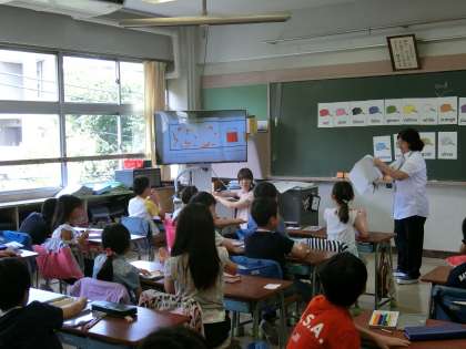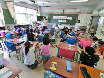 今日の1校時、3年2組では、今年から3年生で始まった「外国語活動」の学習が進められていました。3年生と4年生の外国語活動では、担任とALTの先生が一緒になり協力して授業を進めています。
