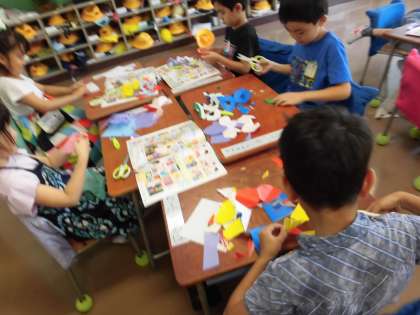今日の図工は、はさみやのりを使って飾りを作りました。