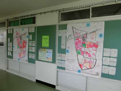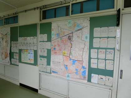学区域探検を行って、発見したこと、分かったことなどを学区域マップにまとめ、教室前の廊下の掲示コーナーで発表しています。