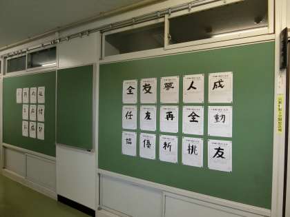 5年生は、1学期を振り返り、心に残ったことや思い出からイメージする漢字1字を選び、毛筆で力強く表現し、解説を加えた作品をつくり上げました。