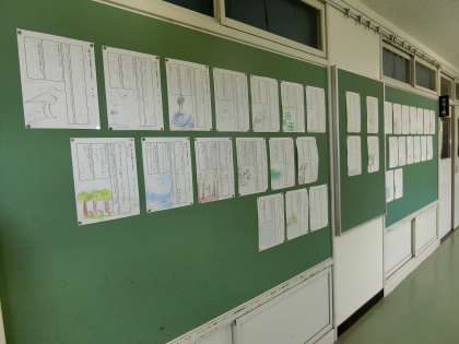 6年生は、日本語の響きやリズムを味わおうの学習で扱った「俳句」で、自分が気に入った作品を選び、現代語訳・選んだ理由(気に入ったところ)・様子や気持ちを想像したことなどをまとめたワークシートを、教室前の廊下の掲示コーナーで発表しています。情景や場面を想像した絵にも、作品に対する一人ひとりの作品に対する思いが込められた素敵な作品です。ぜひご覧ください。