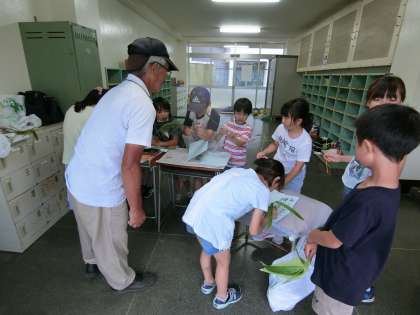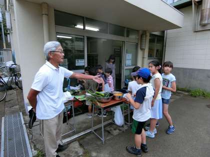 講師の先生のご指導で、ささっちガーデンで生長する夏野菜を観察し、食することができるものの収穫を行いました。また、夏野菜を紹介していただき、先生がご自身の畑で栽培された野菜を食べさせていただきました。甘くておいしい野菜に、参加した子どもたちは大喜びでした。